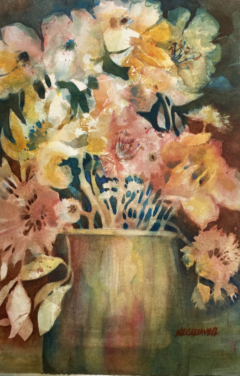 250312-007-HLF, Flowers in Earthen Vase, 22×15, watercolor