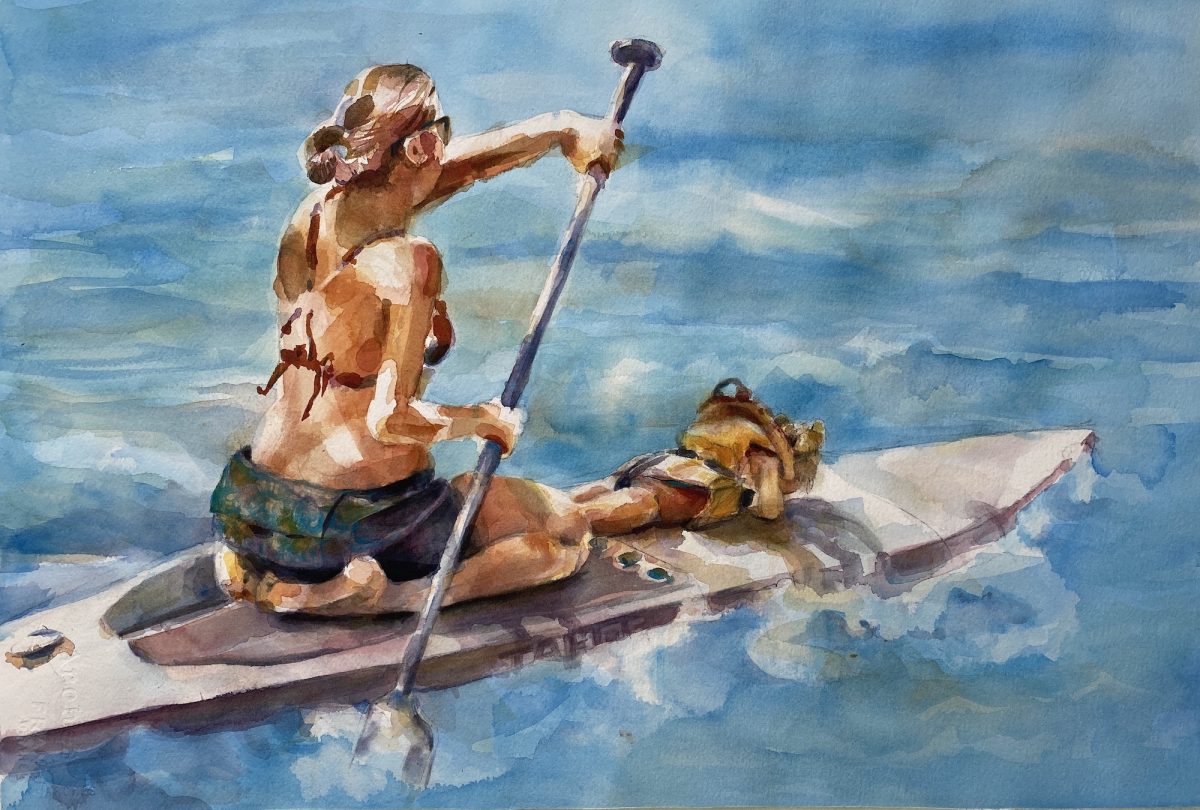 250326-010-HLF, Mother and Child Kayaking, 15×22, watercolor